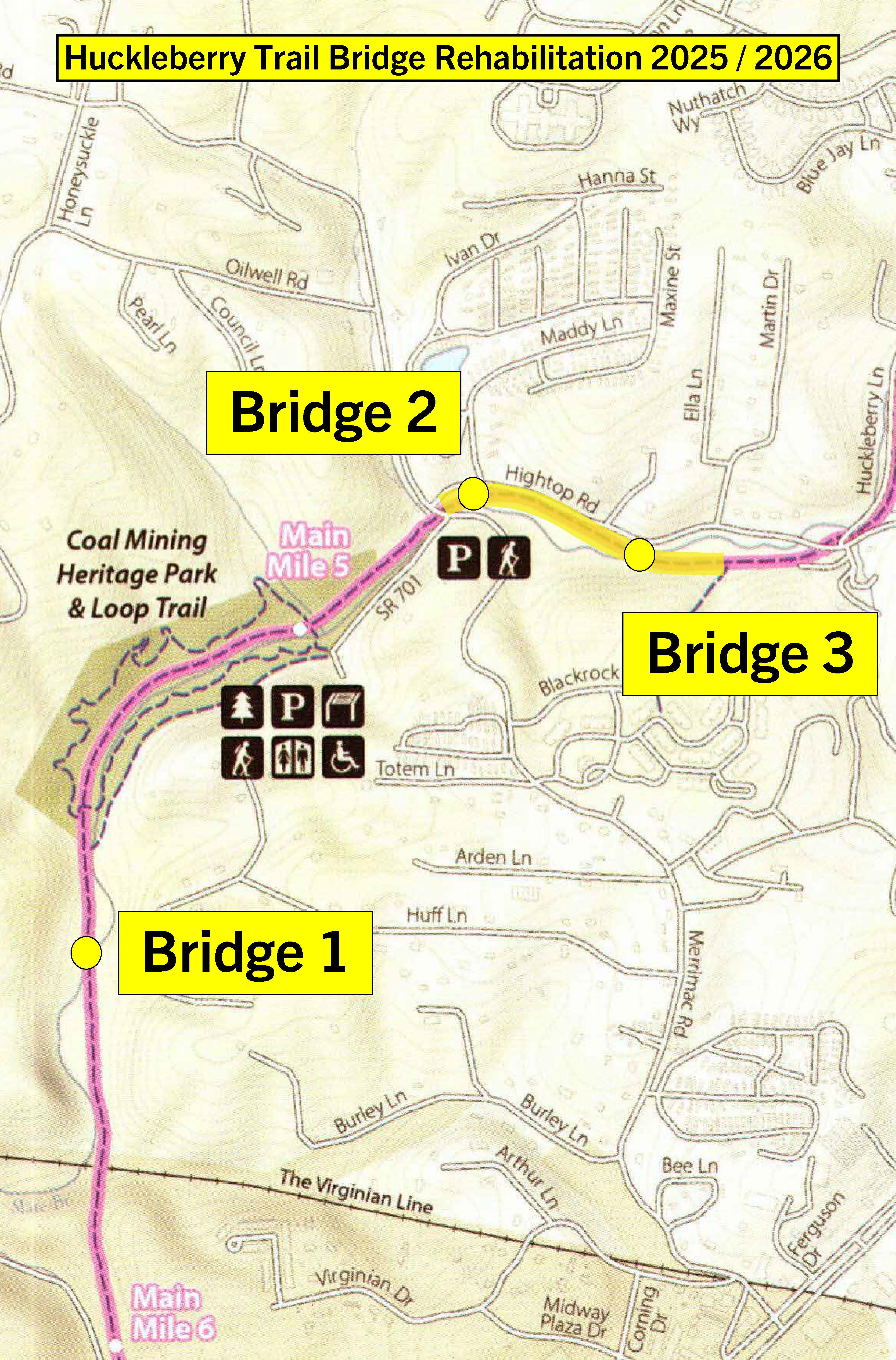 A portion of the Huckleberry Trail between the Uptown Christiansburg/Mall entrance and Merrimac is now open to the public, effective March 12, 2026. This newly reopened section extends the accessible trail from the Uptown Christiansburg/Mall entrance from 1 mile to approximately 1.7 miles and provides access to the restrooms at Merrimac and the Coal Mining Heritage Park.